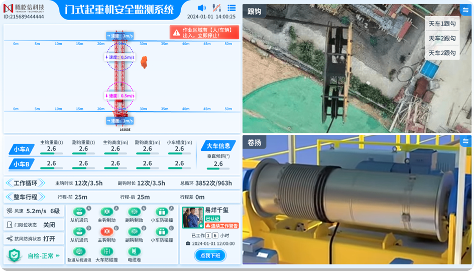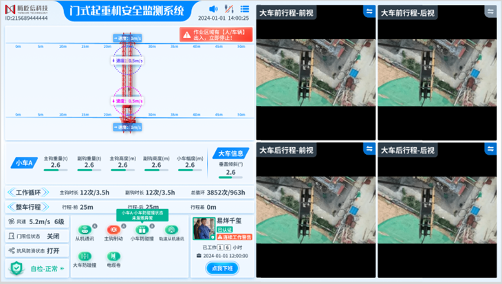 全时全域感知与数字孪生:系统能够对龙门吊的重量、起升高度、大车及小车行程、实时风速等关键参数进行高精度动态监测。